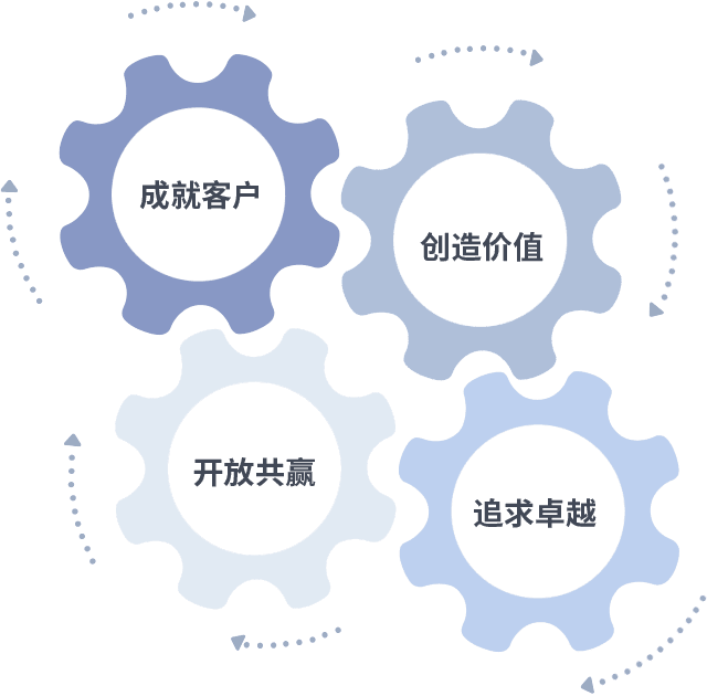 成就客户是一切决策的出发点,,,创造价值是衡量所有工作的标准,,追求卓越是我们做事做人的态度,,,,开放共赢是我们的格局也是最终的结果。。。。价值观的齿轮环环相扣,,,推动着组织里的每个人不断向前。。。