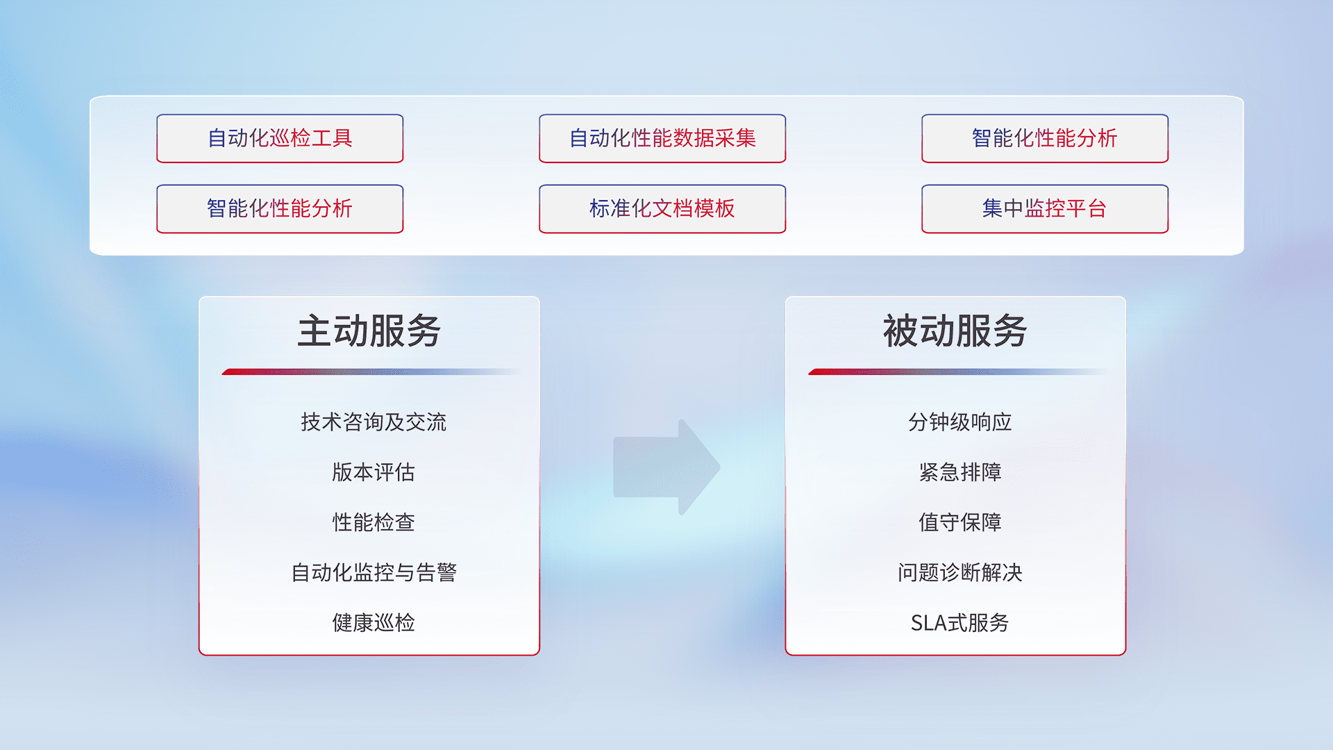 智能化工具和标准化文档,,保障服务质量,,提供主动服务(包含技术咨询、、版本评估、、、性能检查、、、自动化监控与告警、、健康巡检)和被动服务包含(分钟级响应、、紧急排障、、、值守保障、、、问题诊断解决、、、、SLA服务)。。。。